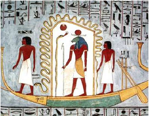 Los mitos del viaje del Sol mezclan la teología y la realidad en la cultura egipcia. Los relatos explican el viaje del Sol por el cielo de Egipto. Ra navega en una barca durante el día, calentando y dando vida al país del Nilo, pero al atardecer, Ra se cambia de barca y recorre en la “barca del anochecer” los peligros del Mundo Subterráneo durante las doce horas nocturnas para renacer de nuevo al amanecer.
