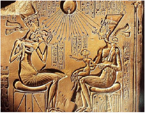 Relieve en el que Akhenatón y su familia son tocados por los rayos solares del dios Atón.